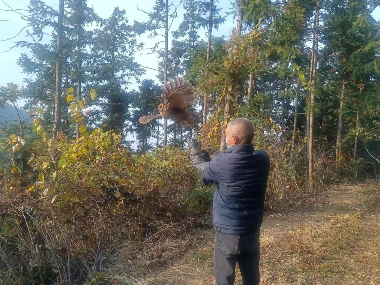 林道间,随着幕布收起、笼门拉开,受助野生动物在众人期盼中或振翅高飞、或盘旋低回、或隐入林间,重返自然。此次放归的灰林鸮、凤头鹰、夜鹭、灰胸竹鸡、狗獾共5只野生动物,均来自京山市陆生野生动物救护中心雁门口百子桥救护点,系该救护点近三个月收容的受伤个体,经工作人员精心照料、康复饲养及野化训练后,已全部恢复健康并达到野外放归标准。京山市自然资源和规划局经前期踏查规划,选定雁门口雷头山作为放归地点。